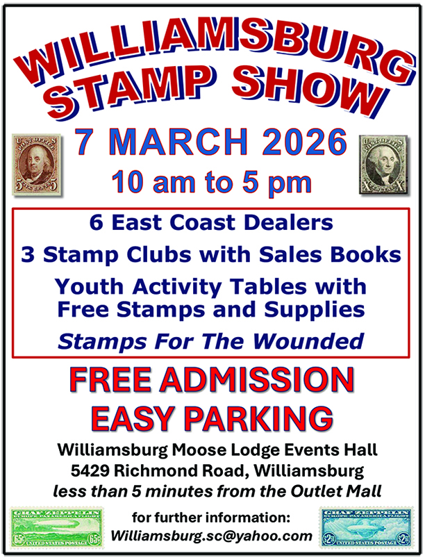 Williamsburg Stamp Show, Williamsburg Moose Lodge, 5429 Richmond Rd. Dealer bourse.