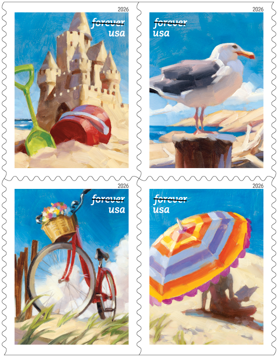 Day at the Beach Forever Stamps For millions of Americans, the beach is the ultimate vacation. Derry Noyes, an art director for USPS, says these stamps were inspired by her annual summertime trips to beaches in New England. “These little snapshots are reminiscent of those experiences–a break from busy lives and demands throughout the year,” she says. Noyes was drawn to the vitality and “fresh, bold spontaneity” that Gregory Manchess brings to the oil paintings shown on the stamps. “He captures the essence of the subject, even at a very small scale,” she says. “Greg has managed to make these scenes instantly recognizable with just the right amount of visual information.”