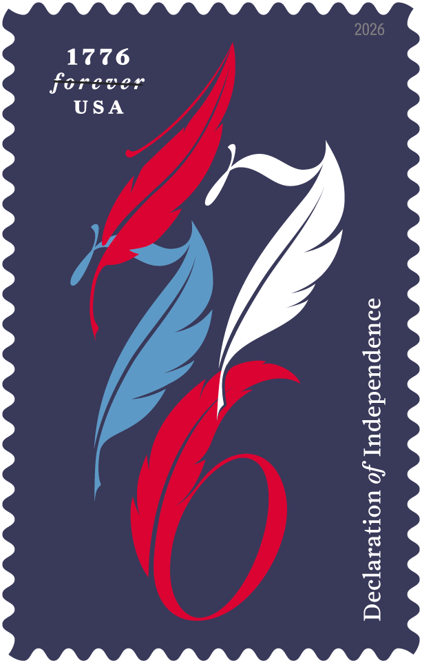 Declaration on Independence Forever Stamp As the nation marks the 250th anniversary of the Declaration of Independence, the Postal Service pays tribute to the document that gave voice to America’s founding ideals with a design that transforms the importance of that document into a minimalist poster. Designed and created by Juan Carlos Pagan, the stamp art features a typographic treatment of “1776,” the year the declaration was adopted. Each numeral takes the shape of a feather quill pen, a nod to the instruments used to sign the nation’s founding document. Pagan worked under the direction of Greg Breeding, an art director for USPS.