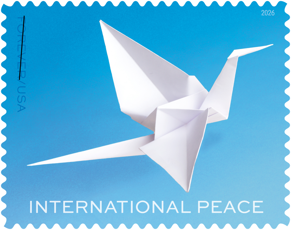 International Peace Forever Stamp Celebrating the goal of international peace, this stamp features a photograph of an origami crane–a global symbol of hope, peace and healing. The crane was folded by artist and Peace Crane Project founder Sue DiCicco and photographed by Sally Andersen-Bruce. Antonio Alcalá, an art director for USPS, designed the stamp.