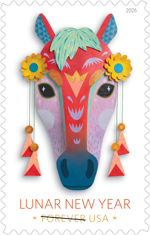 Lunar New Year: Year of the Horse Forever Stamp The Year of the Horse runs from February 17, 2026 to February 5, 2027. USPS will honor the Year of the Horse with the seventh stamp in the current Lunar New Year series. Lunar New Year–also referred to as Chinese New Year or Spring Festival–is one of the most widely celebrated cultural holidays in the world. Beginning in 2020, the Postal Service introduced its latest Lunar New Year stamp series, the third in the organization’s history. This collection features paper-cut masks by artist Camille Chew depicting each of the 12 animals of the Chinese zodiac. Antonio Alcalá, an art director for USPS, designed the stamp using a photograph of the mask by Sally Andersen-Bruce. The Lunar New Year: Year of the Horse stamp will be issued Feb. 3 in Houston.