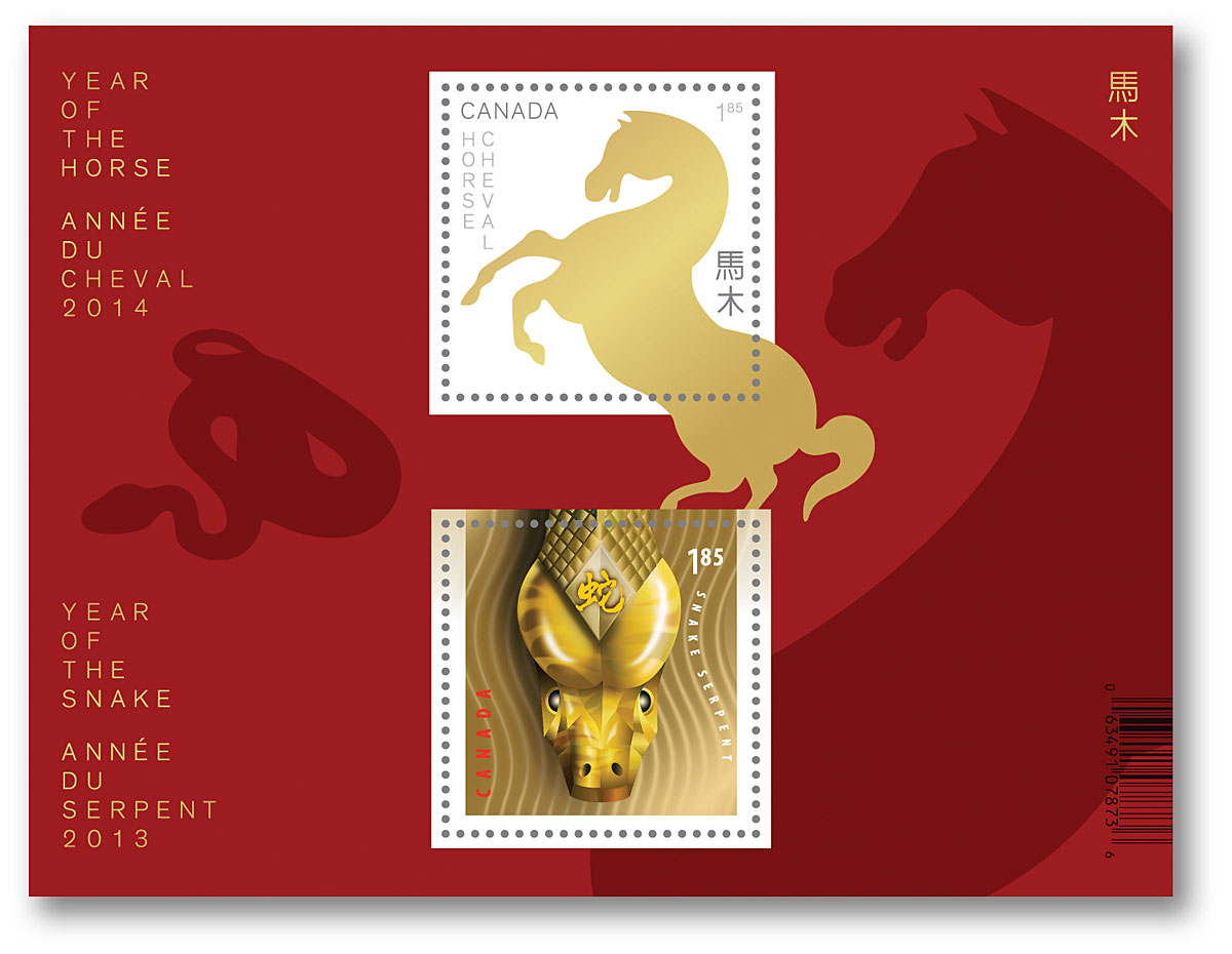 Year of the Horse [Click to see: Year of the Horse Corner Block, Year of the Snake to Year of the Horse , Year of the Horse Official First Day Cover] As has become customary, the first commemorative set of the year from Canada is the annual Lunar New Year set. The set was issued on January 13, in anticipation of the Year of the Horse that began on January 31, 2014 and will run until February 18, 2015. According to the Canada Post news release, “Those born under the sign have more than their fair share of ingenuity, a gift for communication and a taste for the spotlight—traits that also set the benchmark for this year’s stamp design. Throughout the design process, Paprika’s Louis Gagnon and Daniel Robitaille were keenly aware of the need to balance innovation and tradition. They focused on attributes that would not only result in . . . Continue reading "Canada Kicks Off 2014 With Lunar New Year Set" [PDF Document] |