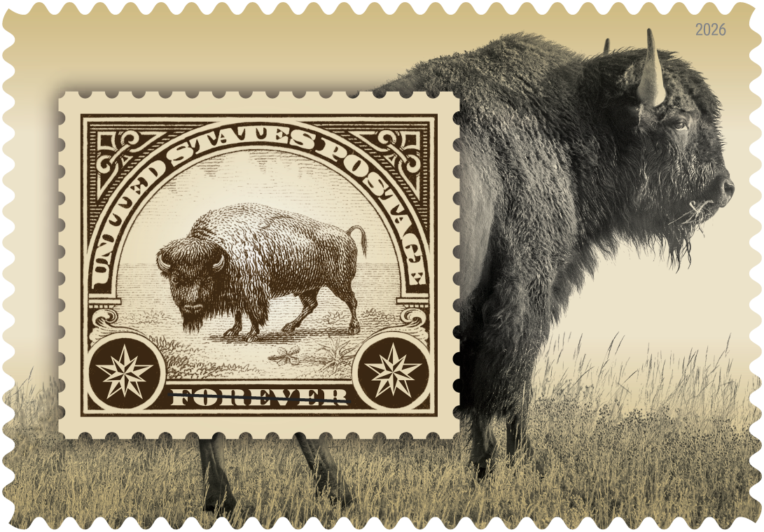 American Bison Forever Stamp The buffalo’s epic story has played an enduring role in shaping America’s identity. Honoring our national mammal while saluting historic philately, this unique stamp features a contemporary photograph of a bison, inset with artwork evoking a 1923 stamp issued when the species was beginning to rebound from near extinction. Greg Breeding, an art director for USPS, designed the stamp using Tom Murphy’s existing photograph and artwork from the century-old stamp, now printed in intaglio. |