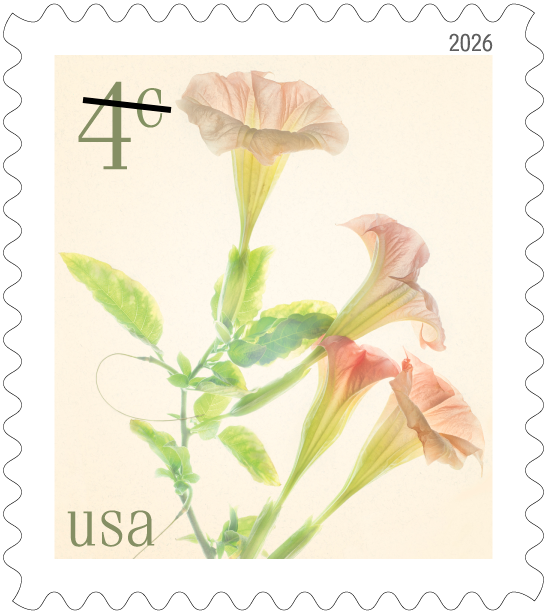 4-cent Angel’s Trumpets Definitive Stamp Ever since the Transportation Series of the1980s and 1990s the Postal People have struggled to find a popular theme for its low value definitives. As in they don’t have enough floral issues each year, this 4-cent stamp follows the 2024 release of other low-denomination flower stamps: the 1-cent Fringed Tulip, 2-cent Daffodils, 3-cent Peonies, 5-cent Red Tulips and 10-cent Poppies and Coneflowers. To create these images, photographer Harold Davis backlit the flowers on a lightbox and combined multiple photographic exposures, resulting in a luminous, transparent look. Ethel Kessler, an art director for USPS, designed these stamps. |