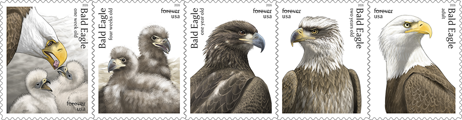 Bald Eagle Forever Stamps: Hatchling to Adult Since the early days of the republic, these magnificent raptors have appeared on numerous stamps. For a new take on this American icon, the Postal Service will issue a pane of stamps featuring realistic illustrations of bald eagles at different stages of life. Derry Noyes, an art director for USPS, designed the stamps using original paintings by ornithologist and illustrator David Allen Sibley. “While the bald eagle is known to virtually all Americans as our national bird, few people know much about them,” says Sibley. “Showing the series of life stages in these stamps is a simple and visual way to emphasize that the familiar adult eagle has already lived through a series of transitional plumages, finding food, migrating and surviving all of life’s challenges. I hope these stamps spark curiosity and a greater appreciation for the lives of eagles.” |