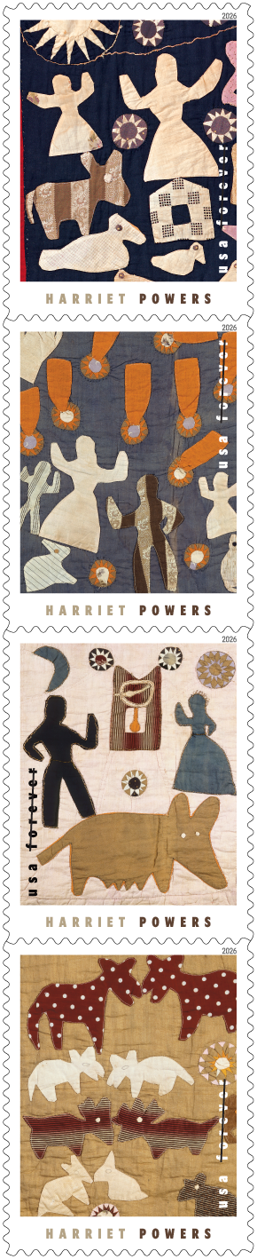 Harriet Powers Forever Stamps Quiltmaker Harriet Powers (1837-1910), who learned to sew while enslaved on a plantation near Athens, Georgia, stitched works that are celebrated as masterpieces of American folk art and storytelling. Derry Noyes, an art director for USPS, designed the stamps and pane (the size of which has not been announced), using details from Powers’ 1898 “Pictorial Quilt,” with its biblical scenes and depictions of local lore.