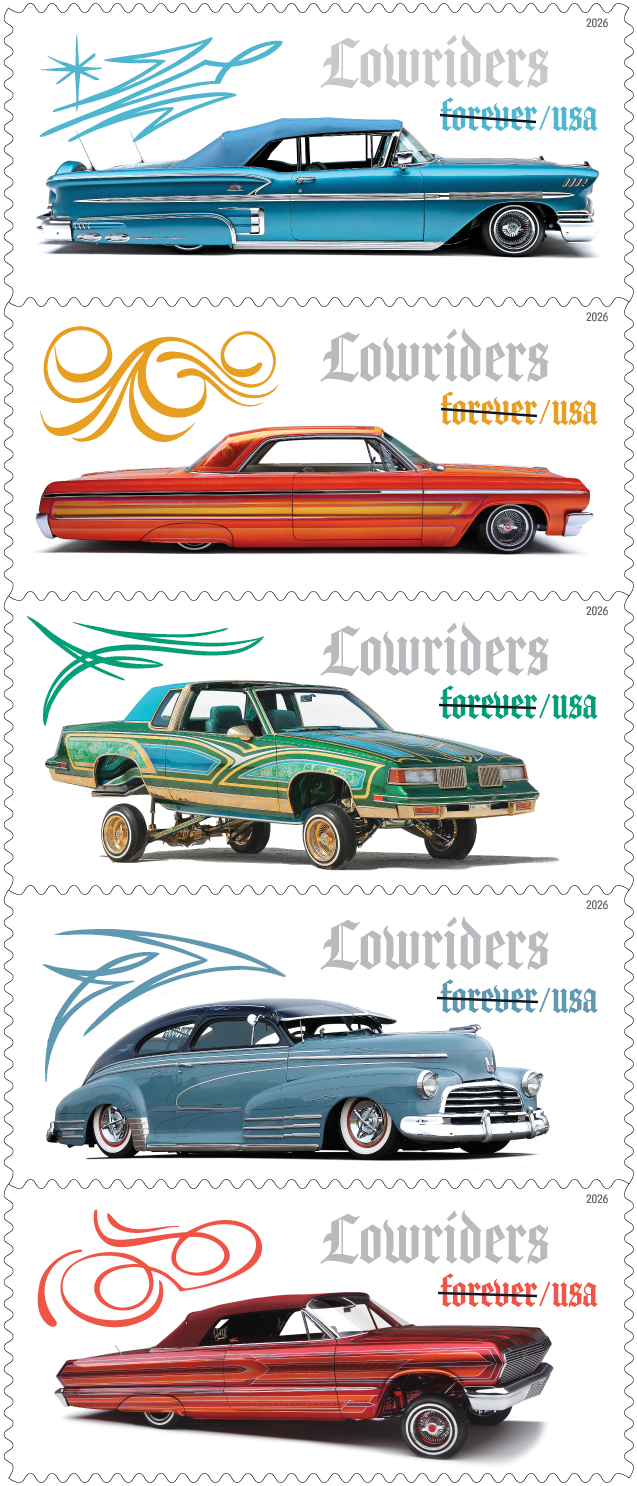 Lowriders Forever Stamps Low and slow: that’s the lowrider. Outfitted with smaller-than-factory wheels, a fancy paint job and a special hydraulic system, these customized automobiles trace their roots to the 1940s-era working-class Mexican American/Chicano communities of the American Southwest. Five models grace the stamps: a blue 1958 Chevrolet Impala named Eight Figures; an orange 1964 Impala named the Golden Rose; a green 1987 Oldsmobile Cutlass Supreme named Pocket Change; a blue 1946 Chevrolet Fleetline named Let the Good Times Roll/Soy Como Soy; a red 1963 Impala named El Rey. The Gothic-style typography and the pinstriping on the stamps and pane evoke the detailed decoration that is a hallmark of the most celebrated lowrider cars. Antonio Alcalá, an art director for USPS, designed the stamps using photographs by Philip Gordon and Humberto “Beto” Mendoza. |