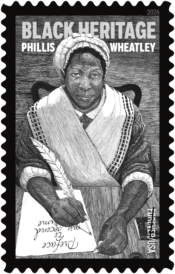 Black Heritage: Phillis Wheatley Forever Stamp The 49th Black Heritage stamp commemorates Phillis Wheatley (circa 1753-1784), the first author of African descent in the American Colonies to publish a book. As an enslaved woman with an education and prominent social connections, Wheatley occupied a unique and remarkable place in Colonial Boston, and is often called “the mother of African American literature.” Antonio Alcalá, an art director for USPS, designed the stamp with a portrait of Wheatley by internationally acclaimed artist Kerry James Marshall. The Phillis Wheatley stamp will be issued Jan. 29 in Boston. |