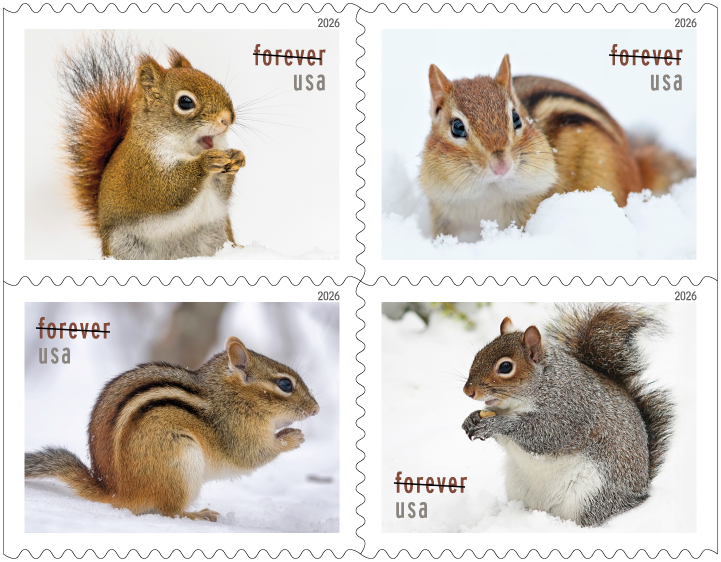 Squirrels & Chipmunks in Winter Forever Stamps This booklet of 20 stamps features three of winter’s most spirited small mammals: two eastern chipmunks, an eastern gray squirrel, and an American red squirrel. The designs capture the resourcefulness and adaptability that help these animals thrive when temperatures drop. From busy foragers to cozy hibernators, they remind us that winter can be full of charm. “When you see the booklet as a whole, the animals’ faces popping up from the snow has a playful effect,” explains Derry Noyes, an art director for USPS who designed the issuance. “The stamps are fun and uplifting. I hope they make people smile, especially in the heart of winter.”