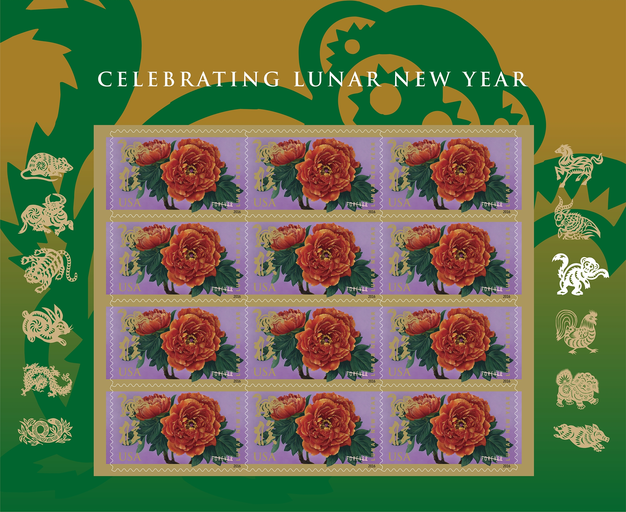 New York artist Kim Mak once again brings us a design that features a traditional form of Lunar New Year celebration. The stamp art features two bright reddish-orange peonies against a purple background. Peonies symbolize wealth and honor in Chinese culture and often decorate the sides of the traditional drums played during the holiday festivities.