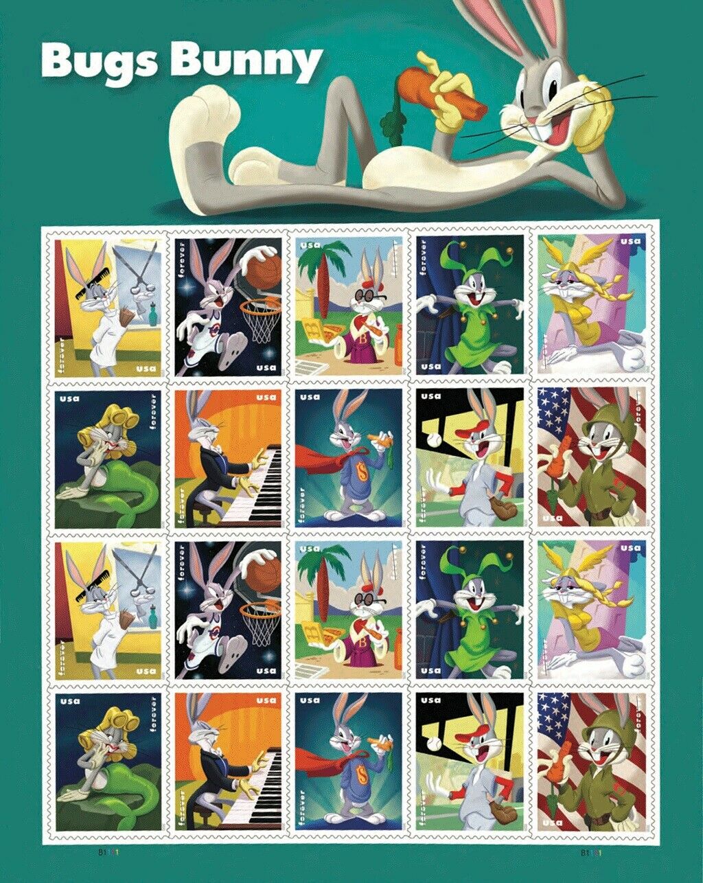 Bugs Bunny 80th Anniversary 10 Forever Stamps The USPS issued these stamps to celebrate Bugs Bunny’s 80th birthday. Best known for his impeccable impersonations and his masterful masquerades, the 10 designs on this pane showcase a costumed Bugs Bunny in some of his most memorable getups. Born of a team of young animators who produced Looney Tunes and Merrie Melodies cartoons, Bugs’ name came from one of those early cartoonists; “Bugs” and “Bugsy” were trendy nicknames at the time, signifying a crazed or wacky disposition. Since his debut in the short-subject cartoon “A Wild Hare” in 1940, generations of audiences have cheered Bugs’ gleeful gusto, quick wit and endless clever resourcefulness. In addition to the stamps, 80 new eleven-minute Looney Tunes Cartoons adapted for present-day audiences from classic storylines will be aired on HBO Max. The stamps and the reverse of the pane were created especially for this issue by Warner Bros. animation artists. |