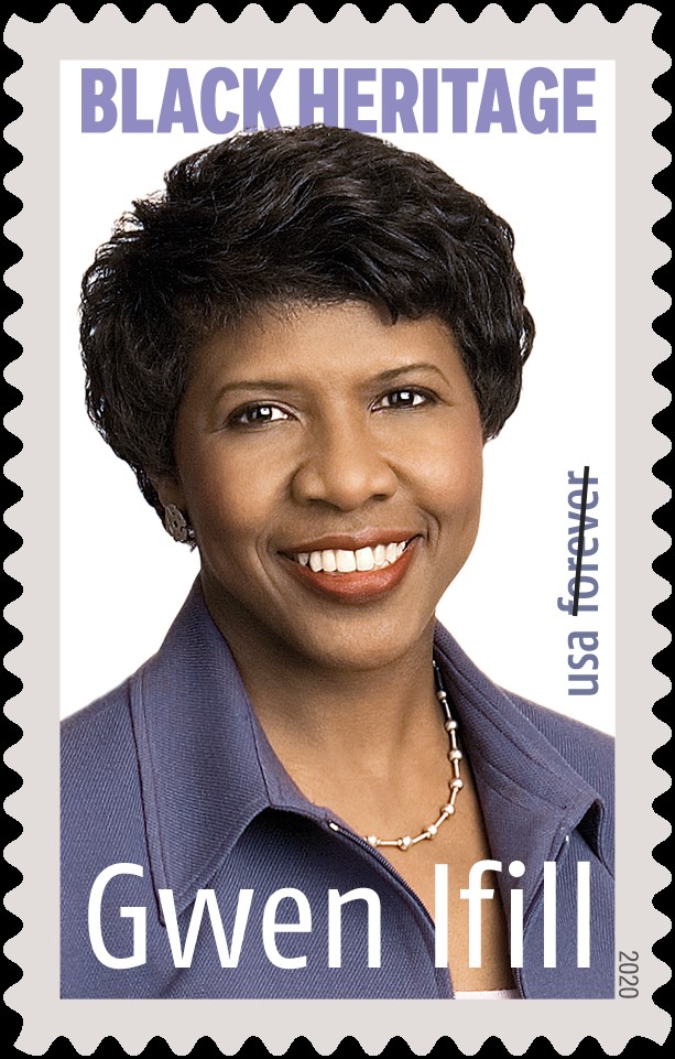 Gwen Ifill Black Heritage Forever Stamp The 43rd stamp in the Black Heritage series that began in 1978 honors Gwen Ifill (1955–2016), one of America’s most esteemed journalists. Among the first African Americans to hold prominent positions in both broadcast and print journalism, Ifill was a trailblazer in the profession. In 1999, she became the first woman of African descent to host a nationally televised U.S public affairs program with Washington Week in Review. The stamp features a photo of Ifill taken in 2008 by photographer Robert Severi. Art director Derry Noyes designed the stamp. |